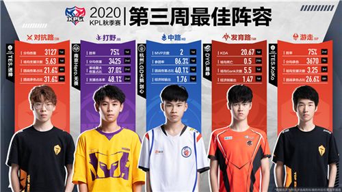 最佳发育路为DYG.易峥。易峥在第三周的KDA高达20.67,在场均Gank 5.50次,频繁主动作战的情况下,场均死亡仅有0.50次,用强大的生存能力支撑起了高额的输出量,经济转输出同样位居发育路第一。在DYG对阵WB.TS的第二局比赛中,易峥选用招牌英雄马可波罗,展现了他过人的时机把控能力,前期果断开大一打二拿下一血,最终打出50.4%的高额伤害占比和2.14的经济转输出,助力DYG完成了对老对手WB.TS的复仇。