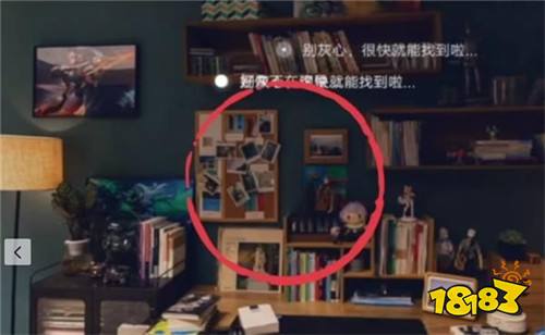 2、第二张位置在书桌这里,点击地板上的白色圆圈就可以了,如下图所示。切换到这个界面,然后,有很多图片这个区域点击就好,完成第2张碎片收集。