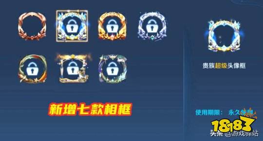 新增7款相框,其中动态相框有五款,分别是贵族初级、高级、特级、超级头像框,以及童趣乐园相框,其中贵族相框在重做后增加了光点闪烁和流光特效,玩家达到指定贵族等级后解锁获得,彰显贵族身份;而童趣乐园动态相框则需要解锁S22的1288典藏进阶战令获得。另外两款非动态相框分别是纸鸢嬉春和启明星使皮肤专属相框,前者采用了和元歌战令皮肤一样的元素设计,后者也取材于虞姬贵8皮肤打造而成,加入三连星图案!