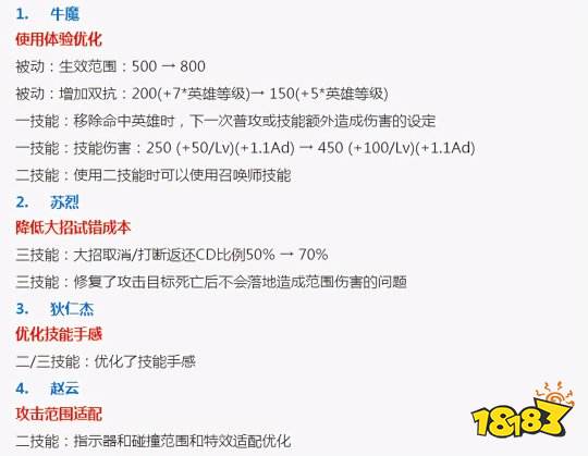 牛魔加强:被动双抗buff范围扩大,但双抗值降低,1技能两段整合为一段伤害,且2技能可衔接召唤师技能。