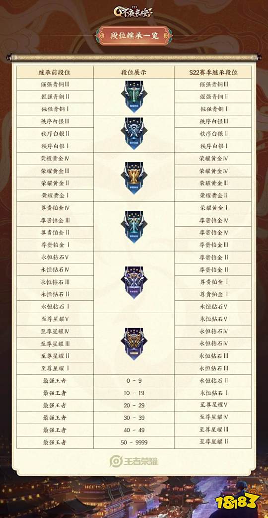 S22赛季将在1月14日开启,排位赛单方增加至三个ban位,狄仁杰的赛季皮肤(历练值100获得)、亚瑟(1级)和元歌(80级)的战令皮肤一同上线,而段位继承图如下: