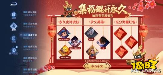 每年春节手Q区和微信区玩家获取永久英雄皮肤的方式并不同,其中手Q区在今年采用集福鲲开永久英雄/皮肤的方式,玩家完成任务可解锁6个奖励,包含了传说、史诗、勇者和普通级别的皮肤,开奖时间锁定10号,还未解锁的玩家记得做任务,因为10号之前遇到不合适的奖励还可以替换!