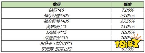 打开可随机获得以下奖励之一:李元芳-银河之约、积分夺宝抵用券*1、英雄碎片*5、皮肤碎片*5、荣耀积分*50、200/400战令经验、钻石*40。