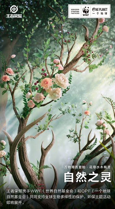 在公布的海报中我们可以清楚的看到树枝上开满各式各样花朵的样子。其实我们仔细看的话,不难发现树枝的形状非常像鹿角。而峡谷中与鹿有关的英雄只有瑶瑶这位英雄我们可以在WWF的官方微博下面看到了,一起迎接王者自然之灵的信息。而配有多张图片,全是都是关于鹿的。在第一张配图中,我们可以清楚的看到一只麋鹿角上顶树枝的效果,和王者荣耀官方发布的海报极其相似。其中表达的信息其实比较明显了,这款皮肤或许将会是瑶的一款联动皮肤。