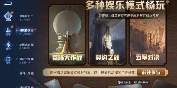 【特权内容】:契约之战、五军对决、克隆大作战活动期间全天开放;且可邀请好友一起参与对局。(未获取特权仅在周五~周日可参与上述模式)