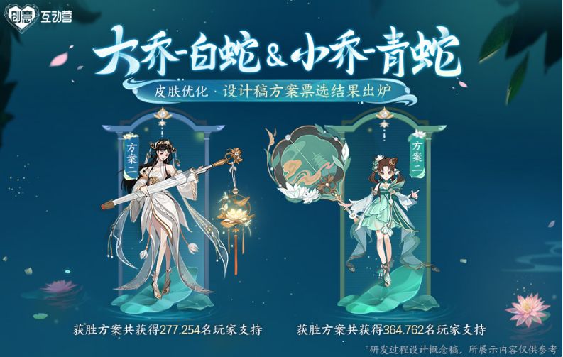 根据活动规则,为了充分尊重拥有青白蛇皮肤的玩家的意见,已获得大乔-白蛇/小乔-青蛇皮肤的玩家们可以为心仪的方案投票,得票数高的方案将作为青白蛇优化的原画设计稿,并以此进入后续建模、海报、展示动画等皮肤制作环节中。
