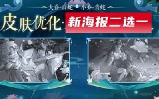 在此前设计稿的基础上,官方一共准备了两版方案供大家选择,新方案依旧是姐妹同屏,需要注意的是票选仅向拥有大乔白蛇或小乔青蛇的玩家开放。其中方案一采用了与原版不同的构图思路,展示了大小乔姐妹在湖上泛舟的场景,同时小乔近景和大乔远景的搭配让原画海报更有层次感,体现了小乔灵动俏皮(大眼萌妹)和大乔温婉的人设。