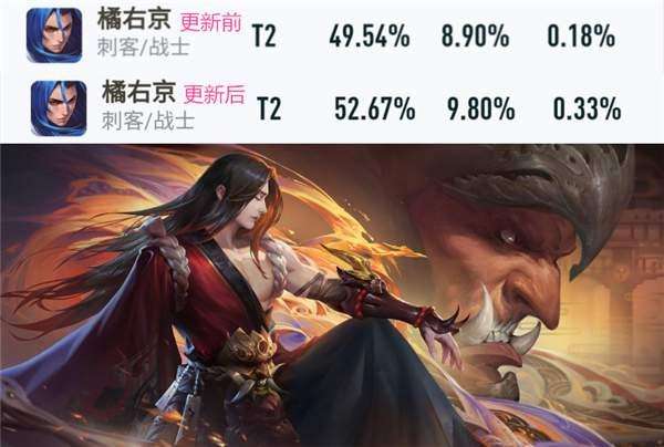 橘右京由于优化了操作手感,其排位胜率从49.54%大涨至52.67%,排名更是暴涨至第十二,后续动态值得关注。