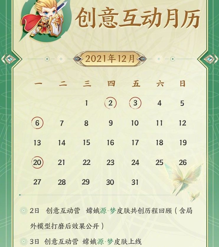 王者荣耀12月皮肤优化计划来了!在本周已开启创意互动周活动,嫦娥的源梦皮肤将在12月3日正式上架,首周折扣60点券,并且官方在今日还发布了创意互动月历,相比之前的优化月历,无非就是添加了嫦娥-拒霜思的共创历程罢了。下面一起来看看这份创意互动月历吧: