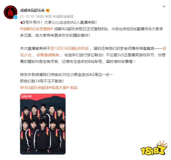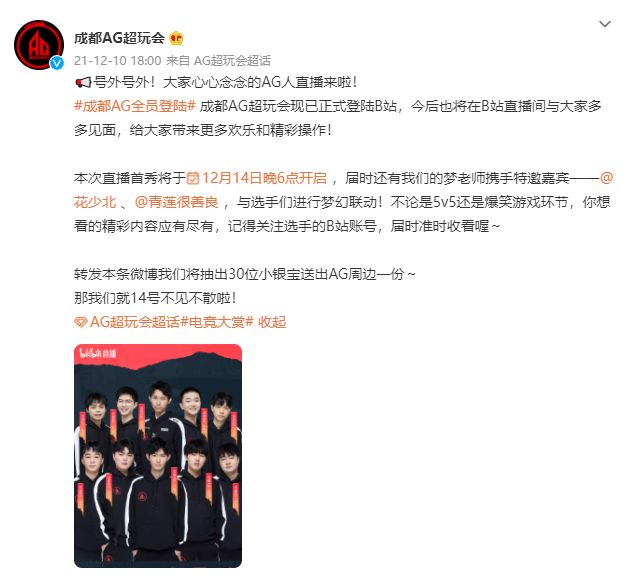 今日成都AG超玩会正式宣布登陆B站,今后也将在B站直播间与大家见面,AG超玩会首次B站直播秀将于12月14日晚6点开启,由梦泪携手b站up主花少北、青莲,与选手们进行梦幻联动!