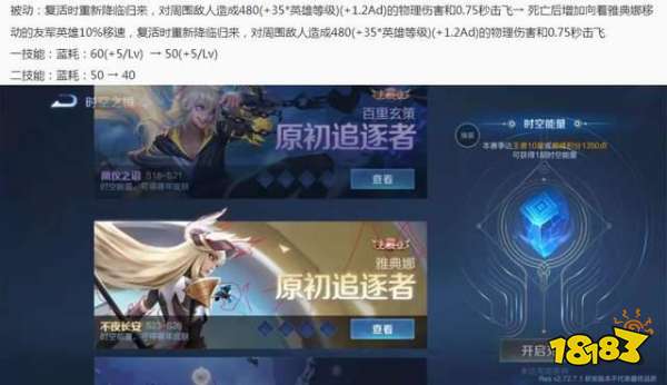 雅典娜加强:被动改为增加友军移速和复活时击飞周围并造成伤害。(雅典娜将在1月初推出免费的赛年史诗皮肤)