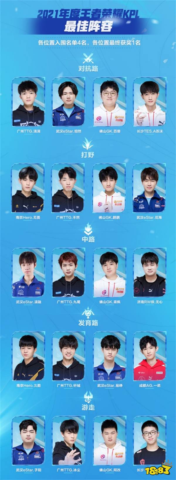2021年度王者荣耀KPL最佳阵容各位置入围四人,最终各位置将有一名选手获奖,入围选手为: