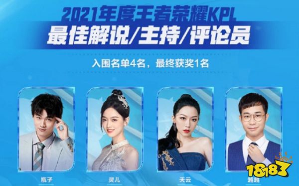 2021年度王者荣耀KPL最佳最佳解说/主持/评论员入围四人,他们是:瓶子、灵儿、天云、越越。