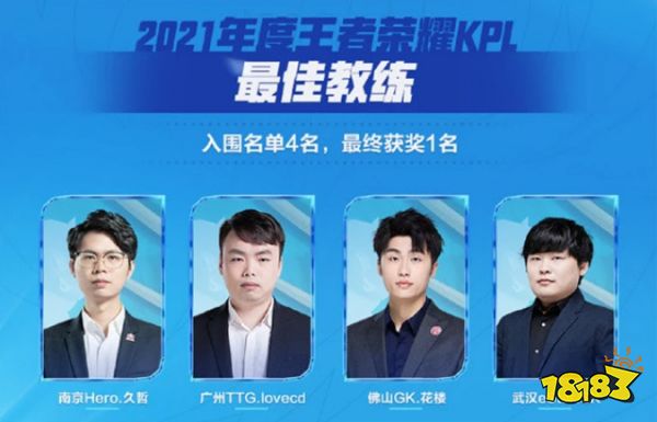 2021年度王者荣耀KPL最佳教练入围四人,他们是:南京Hero.久哲、广州TTG.lovecd、佛山GK.花楼、武汉eStar.SK。