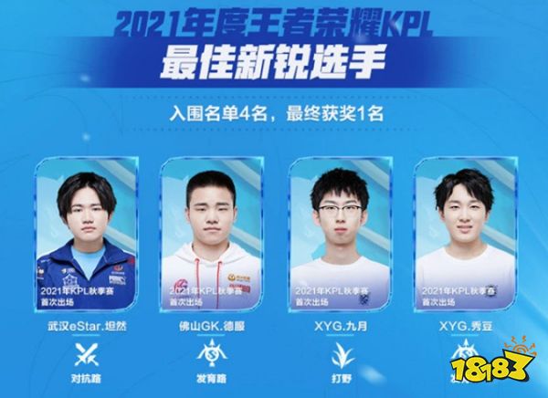 2021年度王者荣耀KPL最佳新锐选手入围四人,四人均为2021年KPL秋季赛首次于KPL登场。他们是:武汉eStar.坦然、佛山GK.德服、XYG.九月、XYG.秀豆。