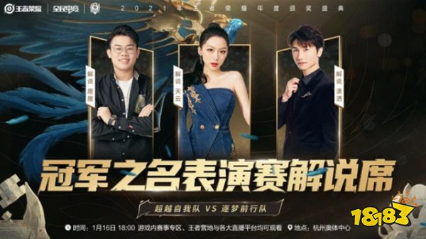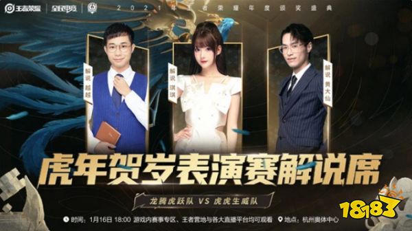 冠军之名表演赛解说席为居居、天云、潇洒。超有趣的虎年贺岁表演赛,相信解说们的解读也会精彩无限,请大家不要错过!