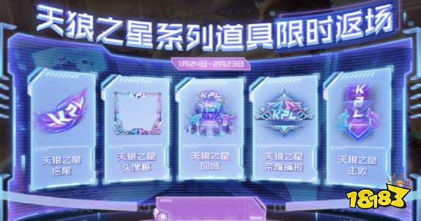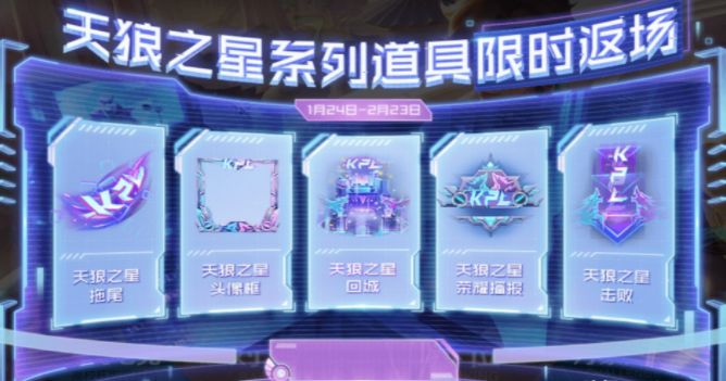 王者荣耀在春节期间有不少返场安排,其中天狼之星局内表现五件套在本周正式返场,包含了天狼之星拖尾、头像框、荣耀播报、回城、击败特效,这5款表现皆可消耗点券必得。而除了天狼系列返场外,春节两款限定皮肤的返场更是直接冲上热搜!