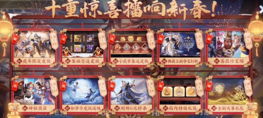 除了以上新活动外,接下来王者峡谷还会上线擂鼓集福签、虎神送福两大获取永久皮肤的活动,其中蔷薇之心有两种方式获取,其一是30号通过“虎神送福”获取;其二是从正月初四(2月4号)开始,玩家完成每日对局和新春挑战等任务即可收集“新年礼炮”,该道具可用来兑换蔷薇之心,若还差一些换取新版孙尚香蔷薇恋人的玩家记得做任务。