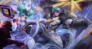 【部件设计】 将安琪拉的头发设计为充满科技感的电路,清透的橙黄与蓝紫撞色为其增添未来感。小板子上的小漂灵为其增添古灵精怪之感;采用了更加尖锐化的造型来增添亚瑟的张力并在其武器和盾中加入电路脉冲。