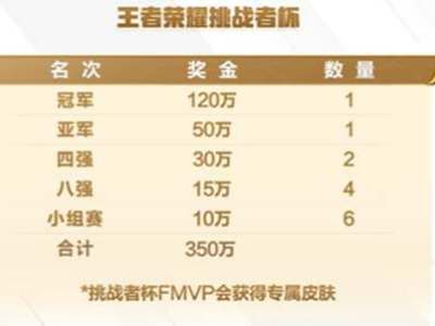 王者荣耀挑战者杯奖池中一共有350万奖金;其中冠军120万,亚军50万,四强30万,八强15万,小组赛10万。