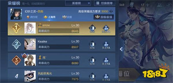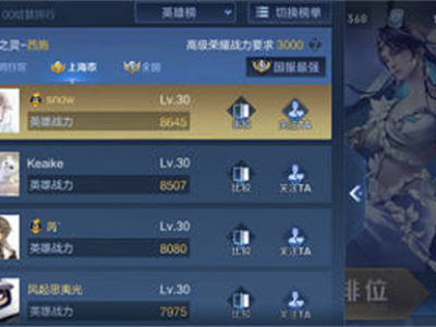 3:你可以在游戏的左侧排行榜中,点击切换榜单,然后我们选择荣耀榜这个选项,然后我们在左上角切换英雄,切换为西施,然后在最下面就可以看到最低的战力要求了,当你超过他们之后就可以成功获得标了。