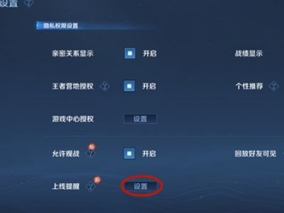 王者荣耀亲密好友上线提醒设置方法:首先打开【功能/隐私】的设置页面,找到【上线提醒】这一项,点击右边的【设置】按钮,取消勾选下图所示的两个功能,这样亲密关系好友上线的时候,就不会通知提醒你了。