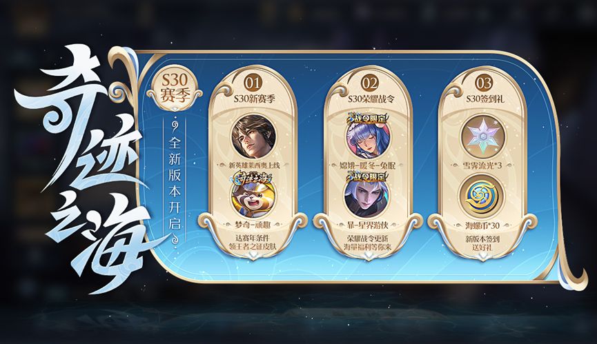 王者荣耀正式服在1月3日上午开启S30赛季,并上线一系列新皮肤和新活动,主要包括:1、六款新皮肤上线;2、冠军阵容折扣;3、累计充值活动开启;4、新英雄莱西奥上线;5、虞姬开放钻石途径;6、碎片商店更新,等等。具体内容如下: