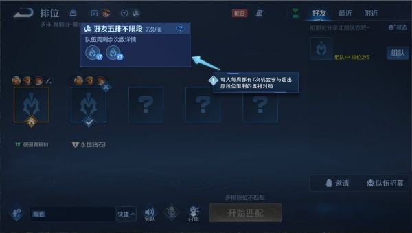 王者荣耀不限段位每人每周都有7次机会参与超出原五排段位限制的五排对局,次数用完后当周无法再参与不限段五排对局。
