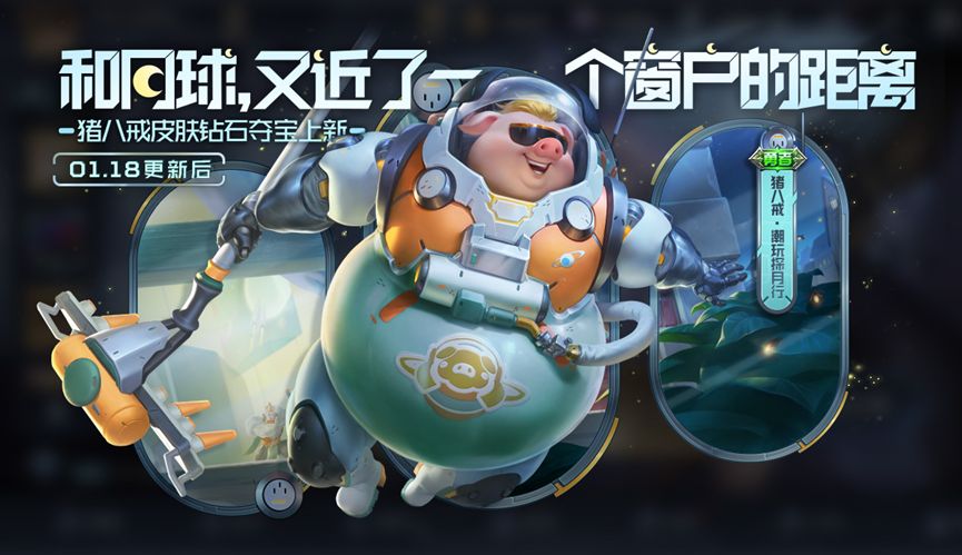 王者荣耀猪八戒-潮玩探月行即将于1月18日上线钻石夺宝商城,肚皮很大,因为里面装满了梦想,Q萌可爱的玩具宇航员,怀揣的登上月球的梦想,踏上冒险的旅程。