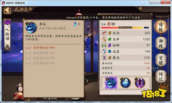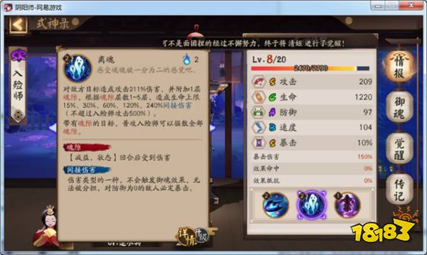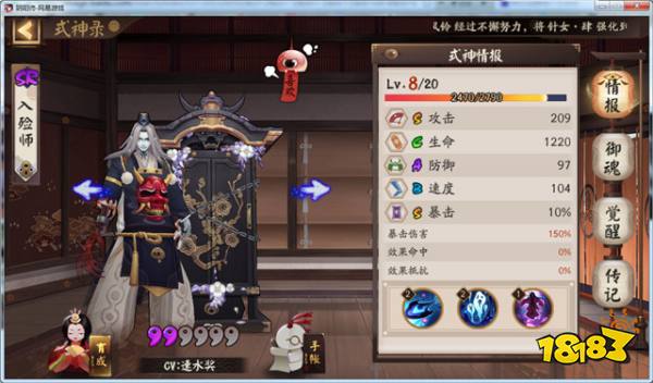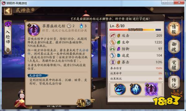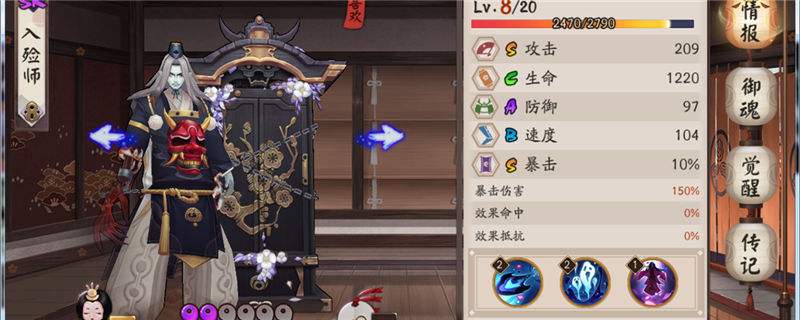 入殓师攻击S、生命C、防御A、速度B、暴击S,定位就是皮厚但是血薄,速度慢,输出不低,暴击在标准线的SR式神,这个跟形象倒是蛮贴切的,毕竟背个大衣柜肯定皮厚耐打。