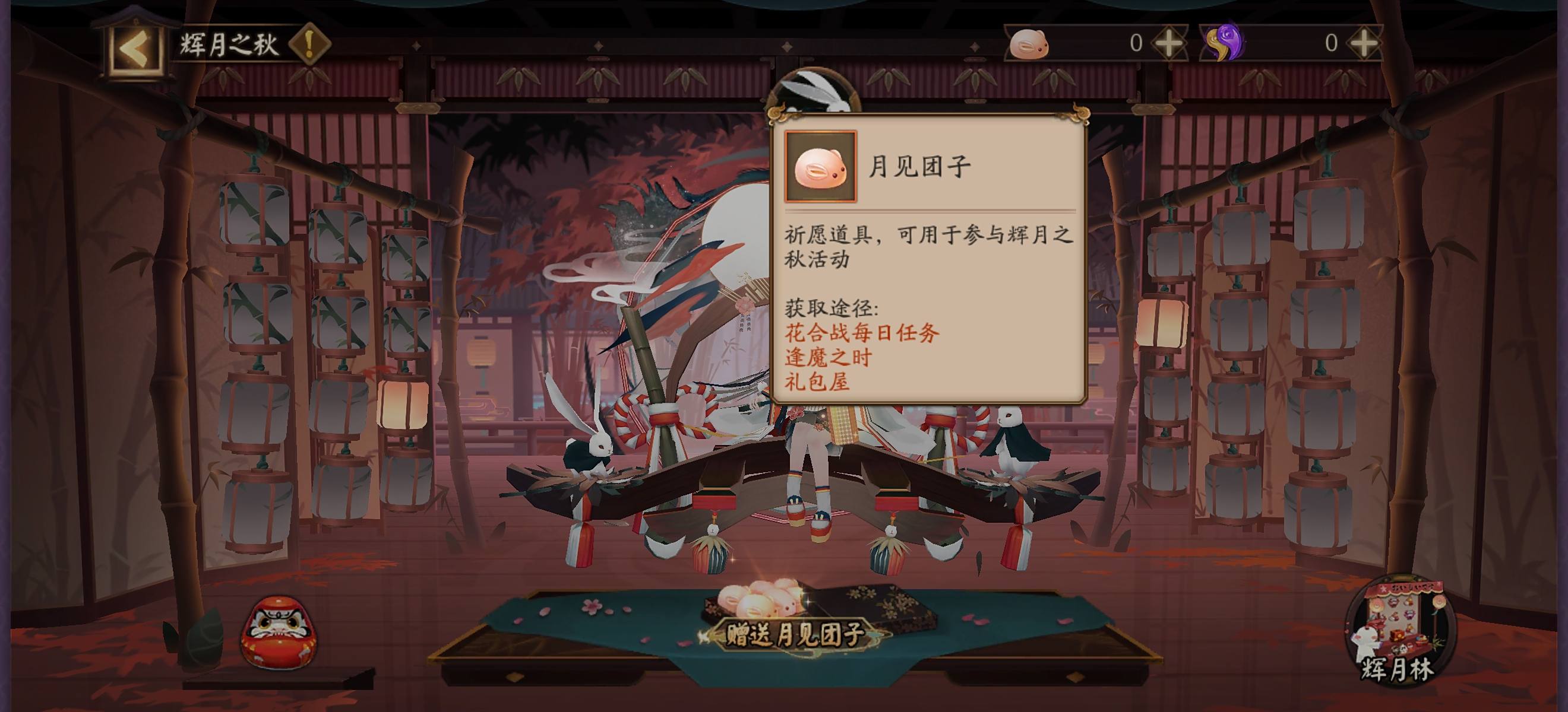 当你拥有四十个以上的香袋的时候就能开始点亮灯笼了,点亮灯笼需要用到氪金道具——月见团子,如果没有氪金的话也能在花合战和逢魔之时BOSS战中也能获得,仔细算一算的话,在活动期间应该是够白嫖玩家翻一轮了。