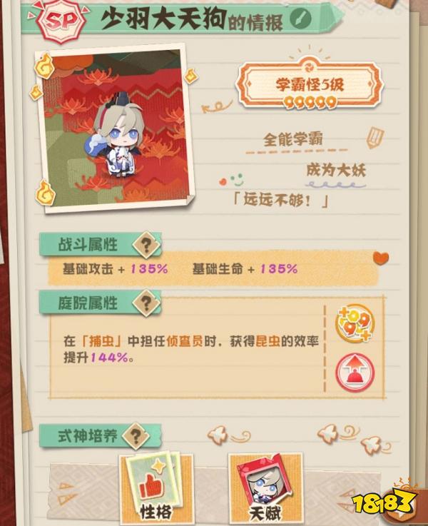 这一队能够应付99%的图。这个推荐是针对愿意砸钱抽卡的玩家,实在不忍心看花了很多钱的玩家听信云玩家的说法浪费资源去培养没啥用的玩意,没错,我说的没啥用的玩意就是大天狗,请大家骂数值策划,不要骂我的崽。ssr里面小天狗,和茨木是唯二单体群体都超一流的式神,其中小天狗的伤害是完全碾压所有式神的。25级小天狗普攻随便1.1w伤害,大招4~5w伤害,永远滴神,万能碎片无脑给他不用犹豫。茨木25级普攻单体1w左右,大招单体群体2.5~3w。椒图、桃花的话是t0工具人,不用纠结养哪个,后期基本需要一起上,椒图辅助清图和小奶、桃花群奶以及boss狂暴之后宝贵的复活。