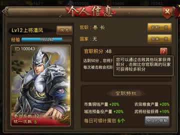 对于实力强、武将多的玩家来说,那你肯定是很想进步的了。你可以不断的击杀敌人来快速提升官职。其中要点就是,只有攻陷敌人的最后一座城池才能获得官职积分,所以在别人打个你死我活之时看准时机抢个人头(攻下最后一城),最后把官职积分收入囊中那肯定美滋滋。