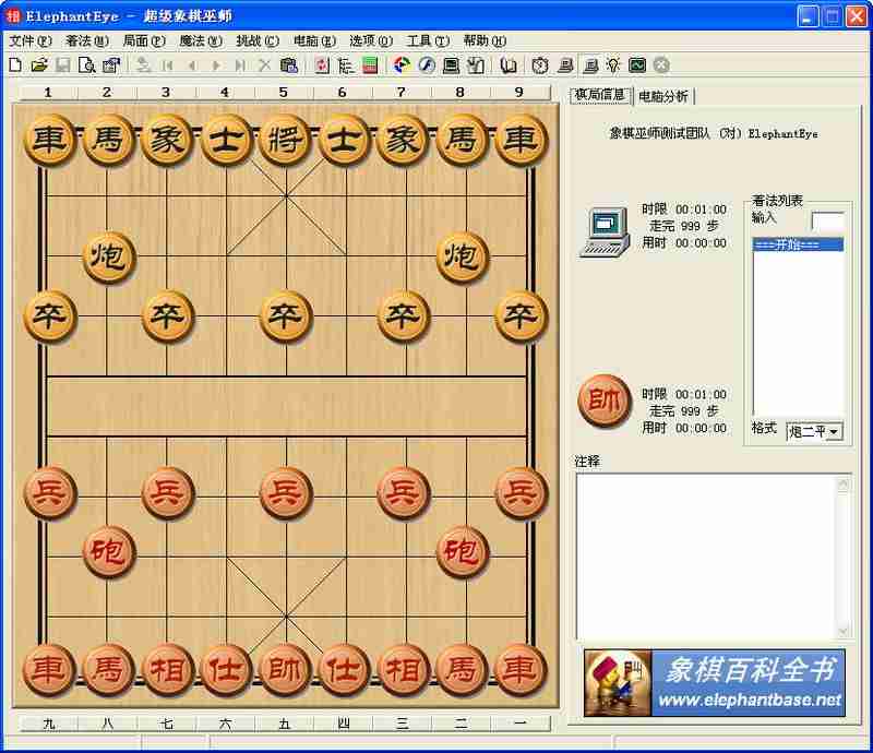 (3) 提供对弈引擎接口,可以进行人机对弈和局面推演,这是《象棋巫师》的主要功能,附带的引擎ElephantEye(象眼)也具有很高的水平。目前UCCI引擎已有10余个,它们可以以《象棋巫师》为平台展开对战。