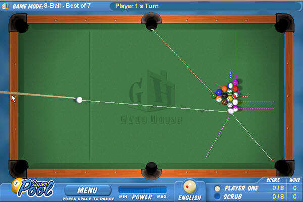 操作设定简单,明确。鼠标左键转动球杆选择击球角度,还可以用键盘的左右方向键进行微调,当出现下球路径后,延伸到袋口的瞄准线还会出现白点提示;按住右键后拉鼠标,控制击球力度,松手即可击球。