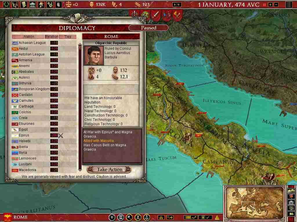 外交:罗马的外交除EU3已经有的外交选项外,又将间谍选项合并到外交中,可以刺杀对方官员、支持叛乱,也可以和对方做贸易。
