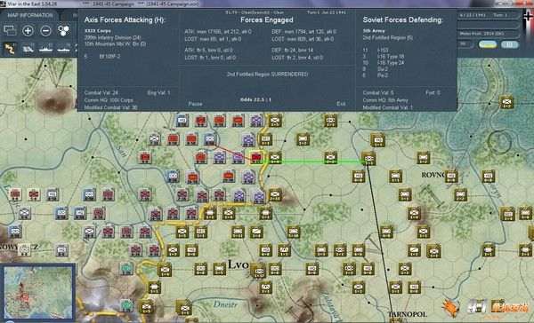 《东线:苏德战争1941-1945》史诗般地描绘了第二次世界大战的东线战场,并因其规模之广、细节之深而成为电子兵棋史上不可多得的佳作之一。它继承了过去著名的东线桌面兵棋游戏和电脑兵棋游戏(War in Russia)的衣钵,是一款师/旅级别的二战回合制策略游戏,游戏以每格10英里的比例,横跨了整个东线地区。