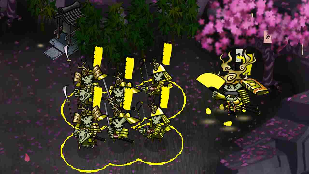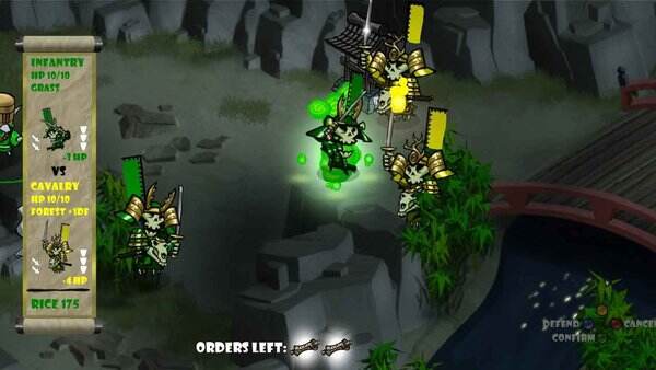 整个游戏和风味十足,对地形和道具的刻画都十分简单,游戏中的武士都是以骷髅的方式出现,由于Q版画风的关系,将军小兵的形象反而十分可爱,玩家能体验到游戏特效设定里将军吃掉骷髅头化为厉鬼,使用回血技能可以看到妖艳的鬼女,还有小兵躲到树丛里可以躲避大量伤害,画面的音效设计成轻松俏皮的旋律,将军吃掉骷髅头打饱嗝儿的音效十分得有趣味性,很多细节设定都让人眼前一亮。