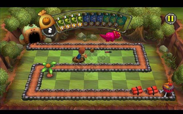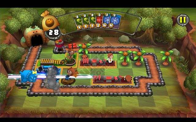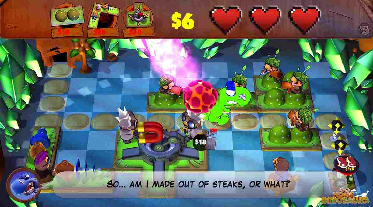 《恐龙回家 Go Home Dinosaurs》是一款融合了酒吧元素的策略塔防游戏。玩家在游戏中扮演一位正在烤肉的金花鼠,而恐龙们闻到香味后,纷纷过来想要吃掉这些烤肉。玩家就需要利用各种卡片,制造出攻击和防御的炮台,来将这些恐龙击退。