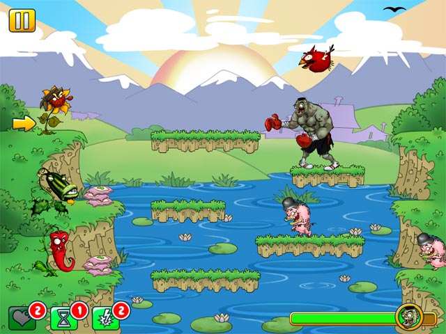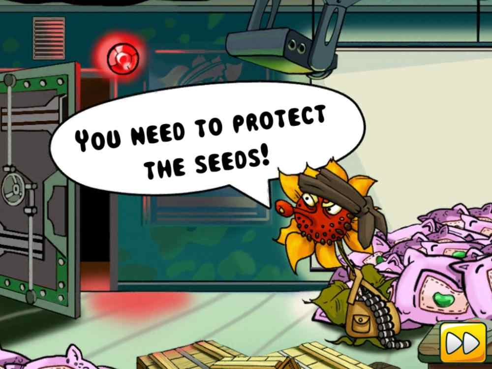 因为植物们面对的是“联合侵略军”,所以敌人的种类比较丰富。僵尸自然是最基本的敌人,它们会拿着手雷冲到种子堆里自爆,也会乘着气球快速的突击,还会 扔出自己的墓碑当盾牌,最神奇的是它们还会开着飞机空投敌人。从僵尸这么劳师动众的架势看,它们一定恨死了植物。至于野猪和鸟类的目的很简单,就是为了偷种子吃。在每关开始前,植物们都会在一起开一个作战会议,明确下一关的作战任务。作战任务除了最基本的守卫种子以外,还有营救队友,掩护撤退,空袭,击杀敌方指挥官等等丰富多变的模式,因此虽然游戏的防御塔比较简单,但是还是给人充实的游戏体验。