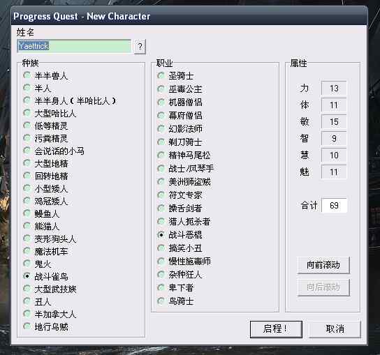 开始一个新游戏时,会显示几个选项供玩家选择,让玩家决定他的角色的种族及职业。而初始状态则是透过模拟掷股子决定,包含力量(Strength)、体质(Constitution)、敏捷(Dexterity)、智力(Intelligence)、智慧(Wisdom)及魅力(Charisma)六项能力值。玩家们以低于水平的装备开始游戏,慢慢地赚取更好的武器、装甲、及咒语。