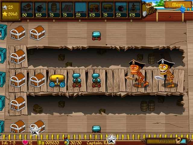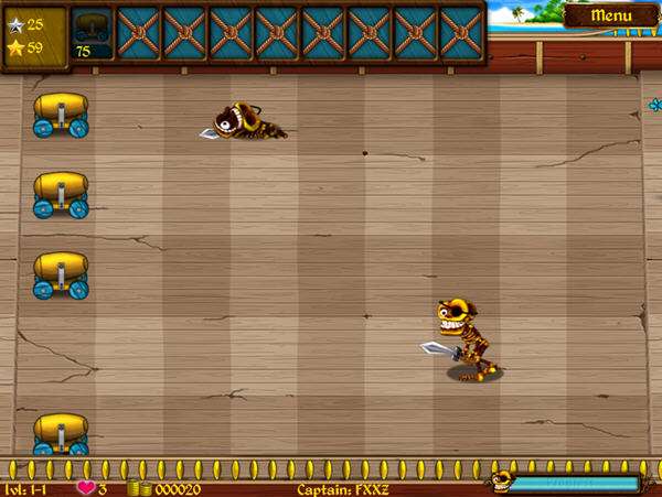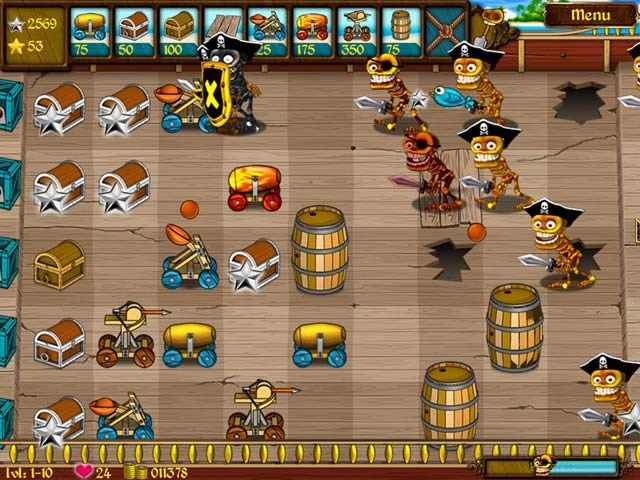 骷髅海盗为了抢夺你船上珍贵的藏宝图,于是对你进行了攻击,你需要利用你船上的军火库进行抵抗:火炮、投石机、弩箭等等,随着关卡的进行,游戏中的敌人也会越来越强大。从这些骨头棒子的手中守护住你的船。