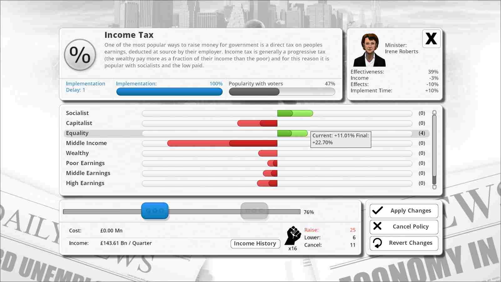你可以在游戏中通过各种指标来查看人们的幸福程度等等,游戏设计的方面比较多,如果你政治有兴趣可以尝试一下成为政治全能手。