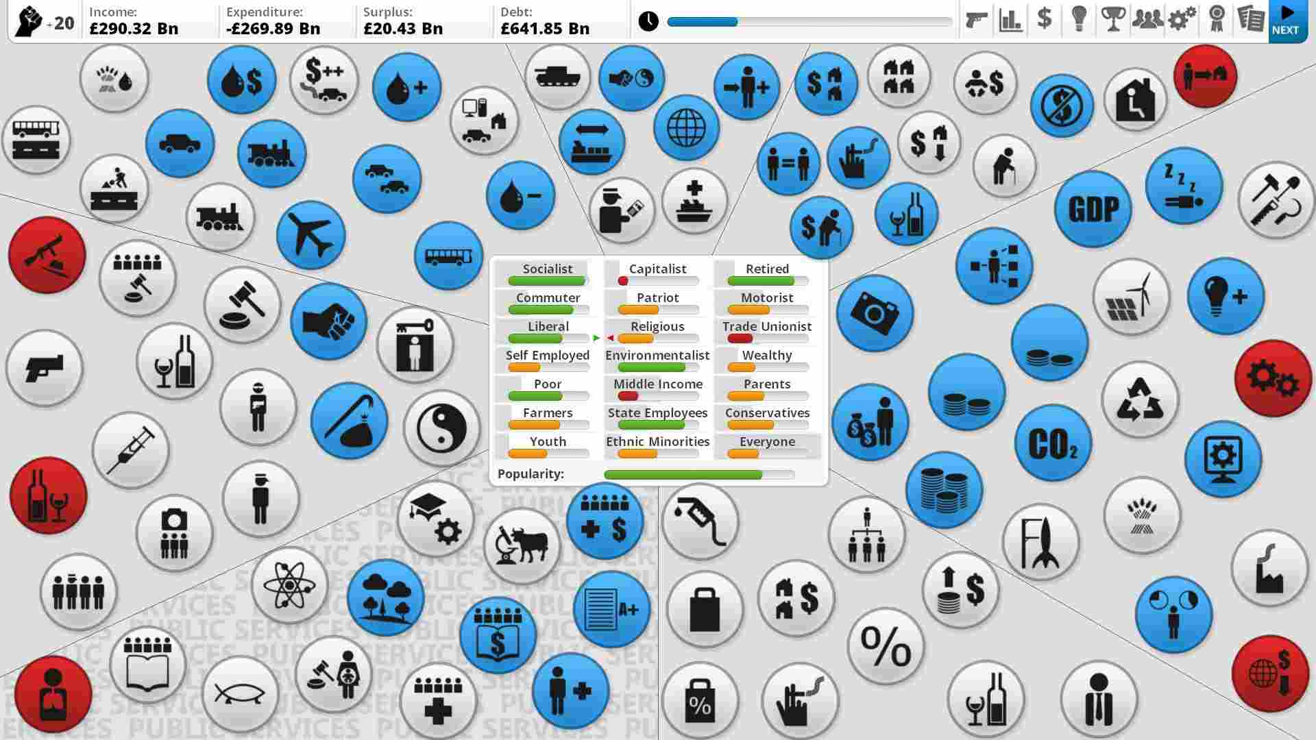 游戏通过让玩家使用政治的手段来控制各种经济,第一次接触的玩家可能会觉得想当难上手,满屏幕的各种图标会让玩家感觉手忙脚乱。