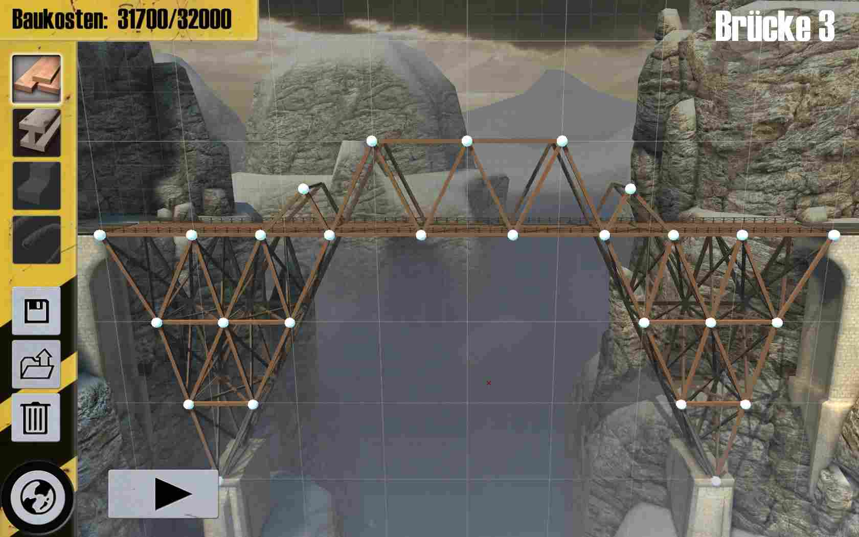 玩家需要善于巧妙的利用地形和了解各种材料的物理属性,并合理利用资金,才能够顺利通关。节约的资金越多,通关分数越高。