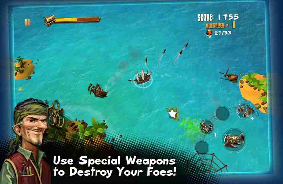 游戏共分为四个章节,每章包含6个关卡,在游戏进程中,玩家需要击败不同的敌舰及其头领。与此同时,玩家还可以通过在线积分榜展示自己的成绩,向世界证明自己才是最伟大的海盗!