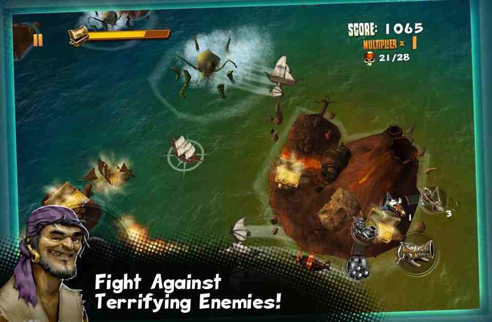 游戏中,玩家需要操控自己的战舰守护画面中央的小岛,保护岛上的财宝,击沉敢来抢劫的海盗,游戏中还会出现一些传说中的大海怪,击杀它们可以获得更高的评分以及金钱。