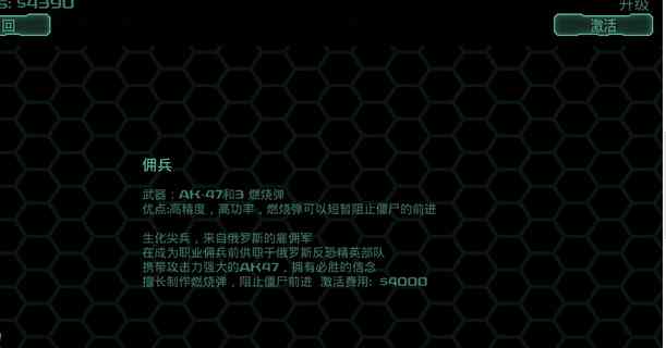 佣兵:生化尖兵,来自俄罗斯的雇佣军,在成为职业佣兵前供职于反恐精英部队,携带攻击力强大的AK-47,拥有必胜的信念。擅长制作燃料弹,阻止僵尸前进。