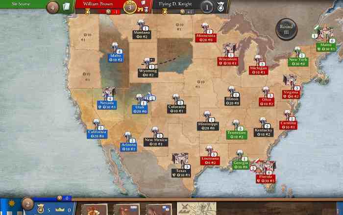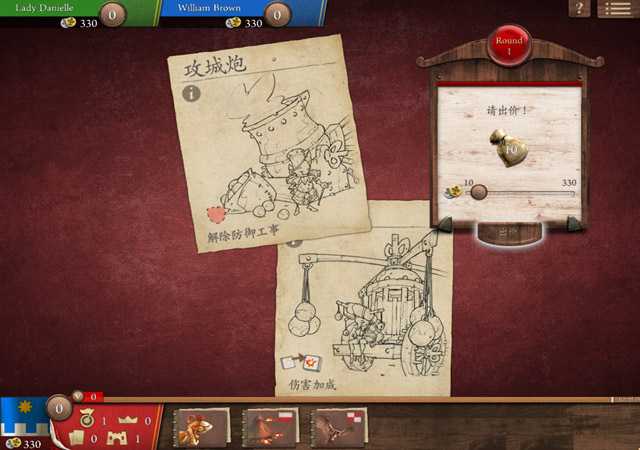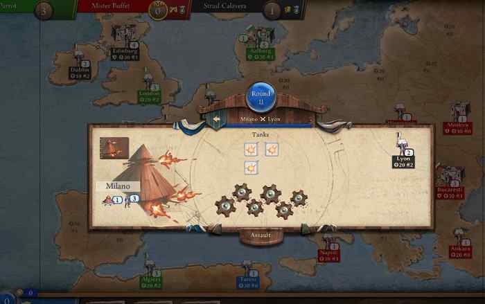 整个地图共有32个国家,除了玩家和对手初始分配外会余下约28-29(视对手数量而定)座 “空城”,每个城市都会标注每个回合的金钱(弗罗林)和士兵产出情况,这个时候需要优先抢占金钱和士兵产出高的“空城”,而后进行的手稿竞拍环节会依据竞 价高低来分配手稿(每次出现的手稿数量为玩家数量-1),手稿固然珍贵,但也要考虑到后面的行动环节。无论是攻击、入侵、建造等等都是需要花钱的。接下来 的行动环节,则和大部分策略游戏一样:行军(士兵转移)、入侵(抢占空地)、建城堡(增加防御)、攻击(攻击敌国)、启用手稿(军事强化)。手稿、兵种、 城堡数量等要素形成了微妙的关系,这样的结果就是游戏有了一套相对完善的制衡系统,在严谨的策略布局之上兵法博弈的细节也很突出。