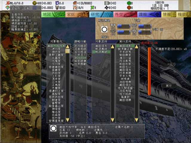 恶名是罪恶其实是个很好的东西,节约团结,宣战,谋略(忍者)等一系列东西啊,当然一定要注意,这里的宣战基本上是对手(包括他的盟友和附 庸)的总石高超过(好像是不低于你的70-80%吧)你的总石高,那就必然会宣了你,因此在合适的时间点于合适的对手接壤(注意海路!这里是设计成处在同 一片海域的地区等于接壤),可以事办功倍。